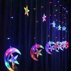 Design Spectaculos cu Stele și Lună: Instalația prezintă o perdea de 12 stele, alcătuită din 6 luna cu stele mari și 6 stele mici. Aceste stele luminoase creează o iluminare deosebită și fascinantă, transformând orice spațiu într-un mediu fermecător de sărbătoare.